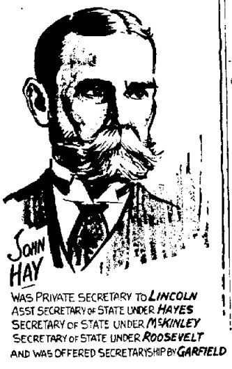 John Milton Hay [Carte de Visite Photograph, J. Gurney-Photography] [Source: Picturehistory.com] John Hay was born in Salem, Indiana in 1938. He studied at Brown Univerity and began the practice of law in the law office of Milton Hay, Springfield, Illinois in 1861. During the Civil War he fought with the Union, held the rank of colonel, and served as private secretary to Abraham Lincoln. After the war, Hay assumed various diplomatic posts in Paris, Vienna, and Madrid, and was appointed ambassador to Great Britain. He was U.S. Secretary of State from 1898 to 1905 in the administrations of Presidents McKinley and Roosevelt. The following John Hay chronology is a verbatim rendition of a Biographical Note, Manuscript Division, Library of Congress, Washington, D.C.: