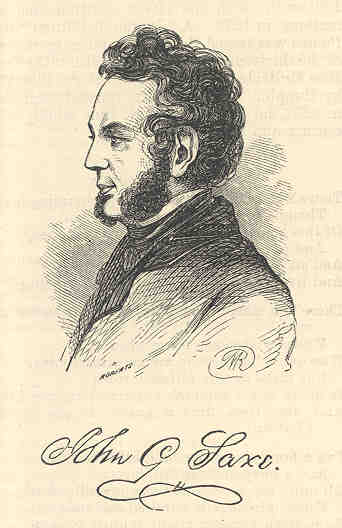 "John G. Saxe was born at Highgate, Franklin County, Vermont, June 2, 1816. He was graduated at Middlebury College in 1839, studied law, was admitted to the bar, and has since been engaged in the practice of the profession in his native State. "In 1849 Mr. Saxe published a volume of Poems including Progress, a Satire, originally delivered at a college commencement, and a number of shorter pieces, many of which had previously appeared in the Knickerbocker Magazine. "In the same year Mr. Saxe delivered a poem on The Times before the Boston Mercantile Library Association. This production is included in the enlarged edition of his volume, in 1852. He has since frequently appeared before the public on college and other anniversaries, as the poet of the occasion, well armed with the light artillery of jest and epigram." [Evert A. & George L. Duyckinck, The Cyclopedia of American Literature 563 (Philadelphia: William Rutter & Co., 1880)(Vol. 2)] John Godfrey